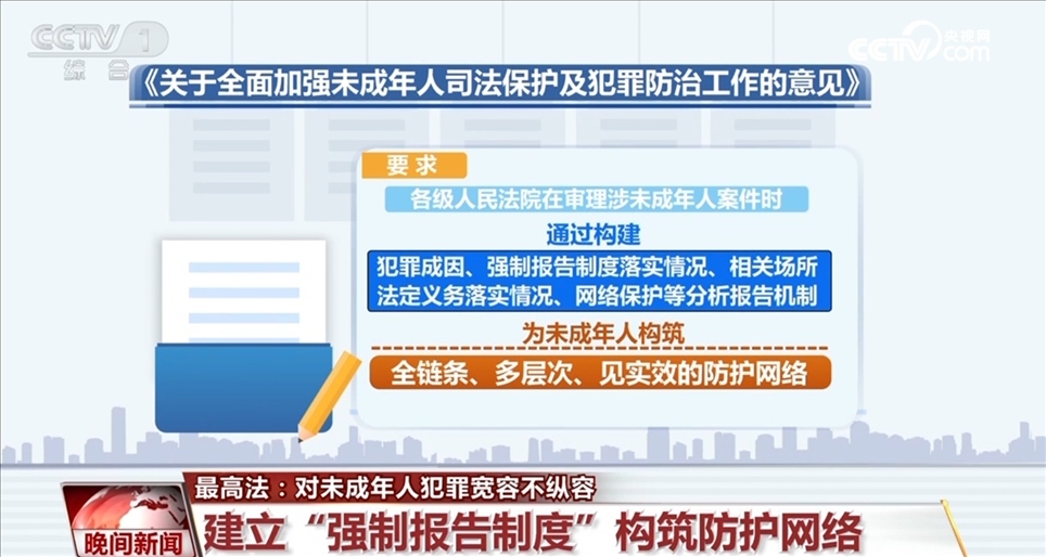 此外,《意見》還要求各級人民法院在審理涉未成年人案件時通過構建犯罪成因、強制報告制度落實情況、相關場所法定義務落實情況、網絡保護等分析報告機制,為未成年人構筑全鏈條、多層次、見實效的防護網絡。