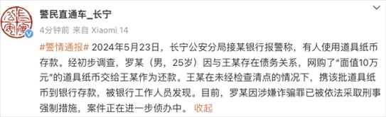 ·警方通報女子拿10萬練功券存銀行:25歲男子網(wǎng)購道具鈔還債,已被刑拘。