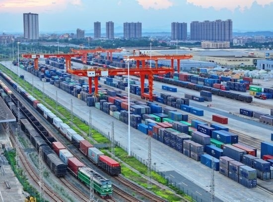 9月4日,江西省贛州市南康區(qū)贛州國際陸港貨場,集裝箱整齊排列,進(jìn)出口貨物正快速有序裝卸。(受訪者供圖)