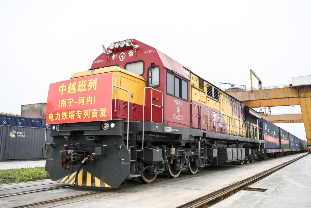 2024年3月8日,在南寧國際鐵路港,一列中越班列準備發(fā)往越南河內。西部陸海新通道鐵海聯運班列和中歐班列、中越班列、中老鐵路等相互銜接聯通,搭建起“多向延伸、海陸互聯”的運輸服務網絡,中國西部地區(qū)面向東盟的國際大通道日趨通達。
