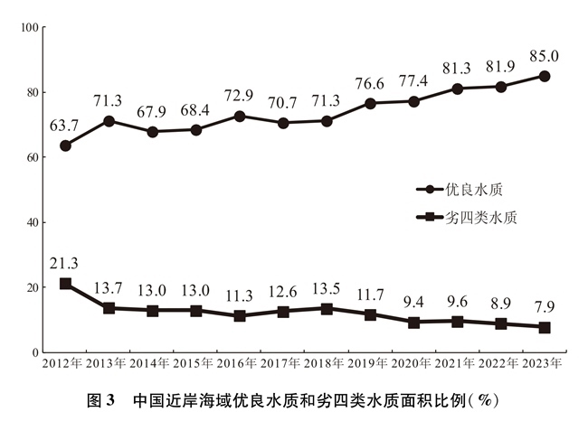 通過深入推進(jìn)重點(diǎn)海域綜合治理、陸海污染協(xié)同防治,持續(xù)建設(shè)美麗海灣,中國(guó)近岸海域水質(zhì)總體改善,2023年優(yōu)良水質(zhì)面積比例較2012年高出21.3個(gè)百分點(diǎn)。