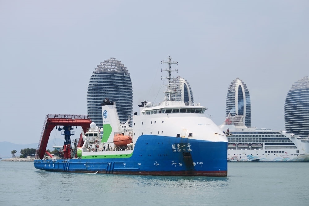 “探索一號(hào)”科考船搭載“奮斗者”號(hào)全海深載人潛水器返回海南三亞(2024年3月28日攝)。此次科考?xì)v時(shí)50天,順利完成中國(guó)-印度尼西亞爪哇海溝聯(lián)合深潛任務(wù)。新華社發(fā)(沙曉峰 攝)
