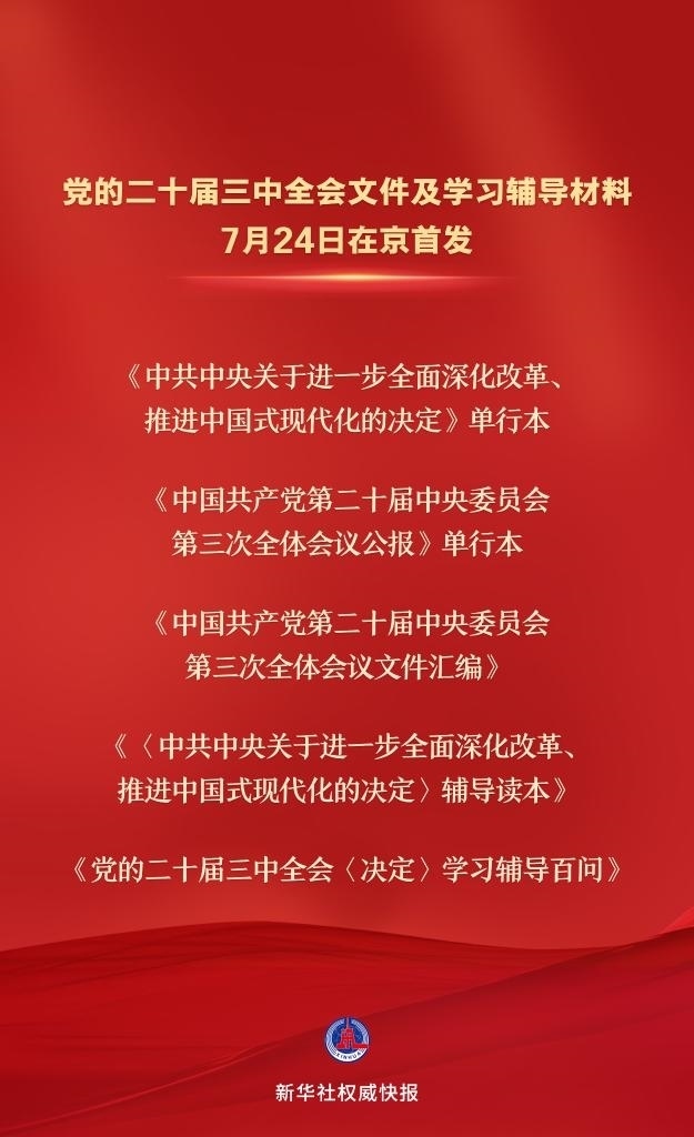 黨的二十屆三中全會文件及學習輔導(dǎo)材料7月24日在京首發(fā)