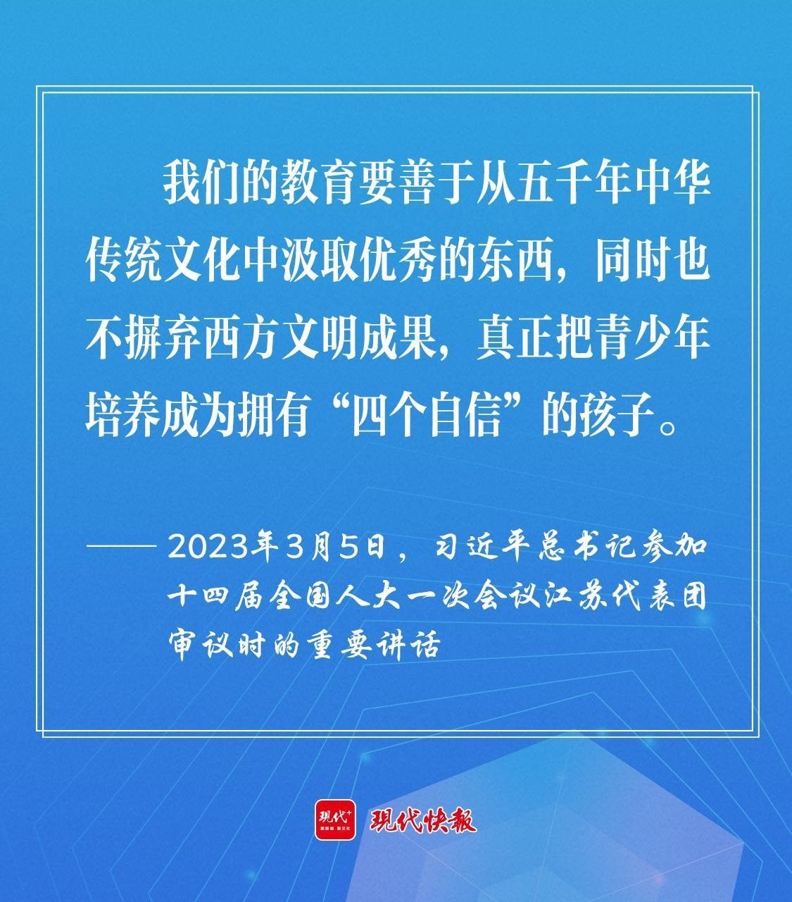2023年3月5日,習近平總書記參加十四屆全國人大一次會議江蘇代表團審議時,勉勵教育工作者“要善于從五千年中華傳統(tǒng)文化中汲取優(yōu)秀的東西,同時也不摒棄西方文明成果,真正把青少年培養(yǎng)成為擁有‘四個自信’的孩子。”