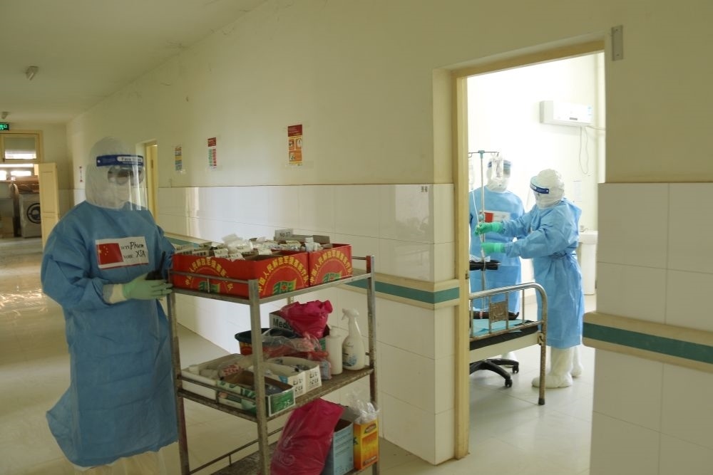 2020年5月26日,在剛果(布)首都布拉柴維爾,中國抗疫醫(yī)療專家組與當?shù)匾痪€醫(yī)務(wù)人員交流,指導(dǎo)新冠肺炎病房建設(shè)。