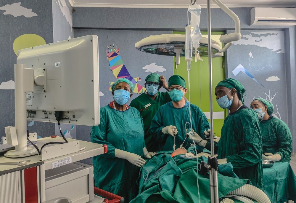2022年10月26日,中國援坦桑尼亞醫(yī)療隊小兒外科醫(yī)生丁國建(中)在坦桑尼亞達累斯薩拉姆的穆欣比利國立醫(yī)院實施小兒腹腔鏡手術(shù)(手機照片)。