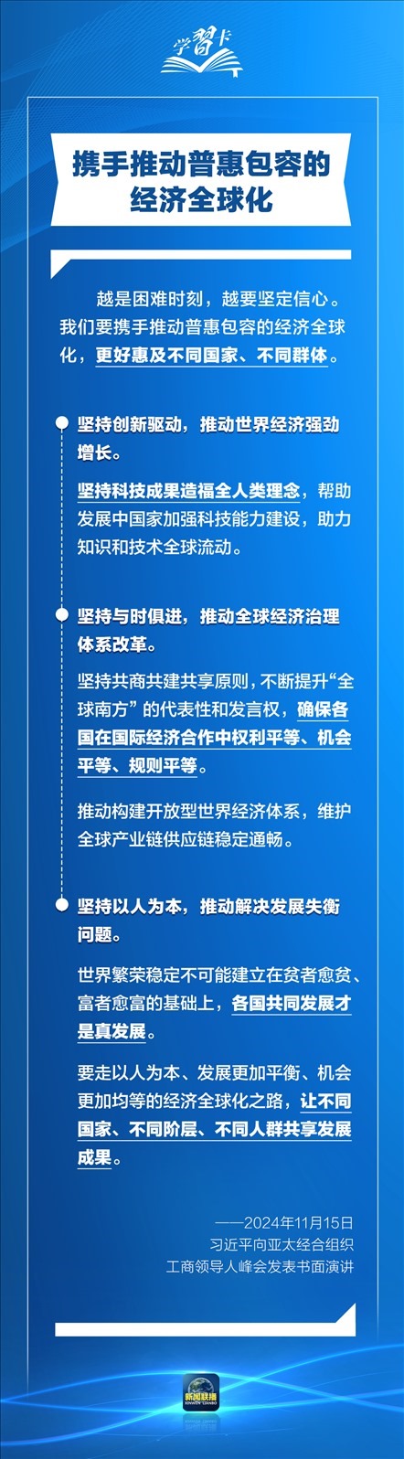 習(xí)近平指出,過去30年,亞太地區(qū)經(jīng)濟(jì)保持了強(qiáng)勁增長,創(chuàng)造了舉世矚目的“亞太奇跡”。如何推動(dòng)構(gòu)建亞太命運(yùn)共同體,打造亞太發(fā)展的下一個(gè)“黃金三十年”?習(xí)主席強(qiáng)調(diào)了一個(gè)關(guān)鍵詞:經(jīng)濟(jì)全球化。一起學(xué)習(xí)↓