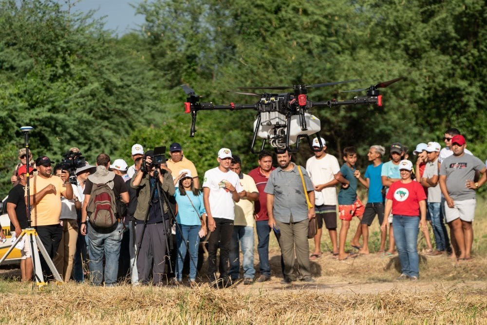 2024年2月2日,中巴農(nóng)業(yè)機(jī)械化合作示范項(xiàng)目啟動(dòng)儀式在巴西阿波迪舉行,第一批來自中國7家農(nóng)機(jī)企業(yè)共31臺(件)設(shè)備正式交付給巴西農(nóng)村勞動(dòng)者組織。這是人們觀看一款中國生產(chǎn)的農(nóng)用無人機(jī)。