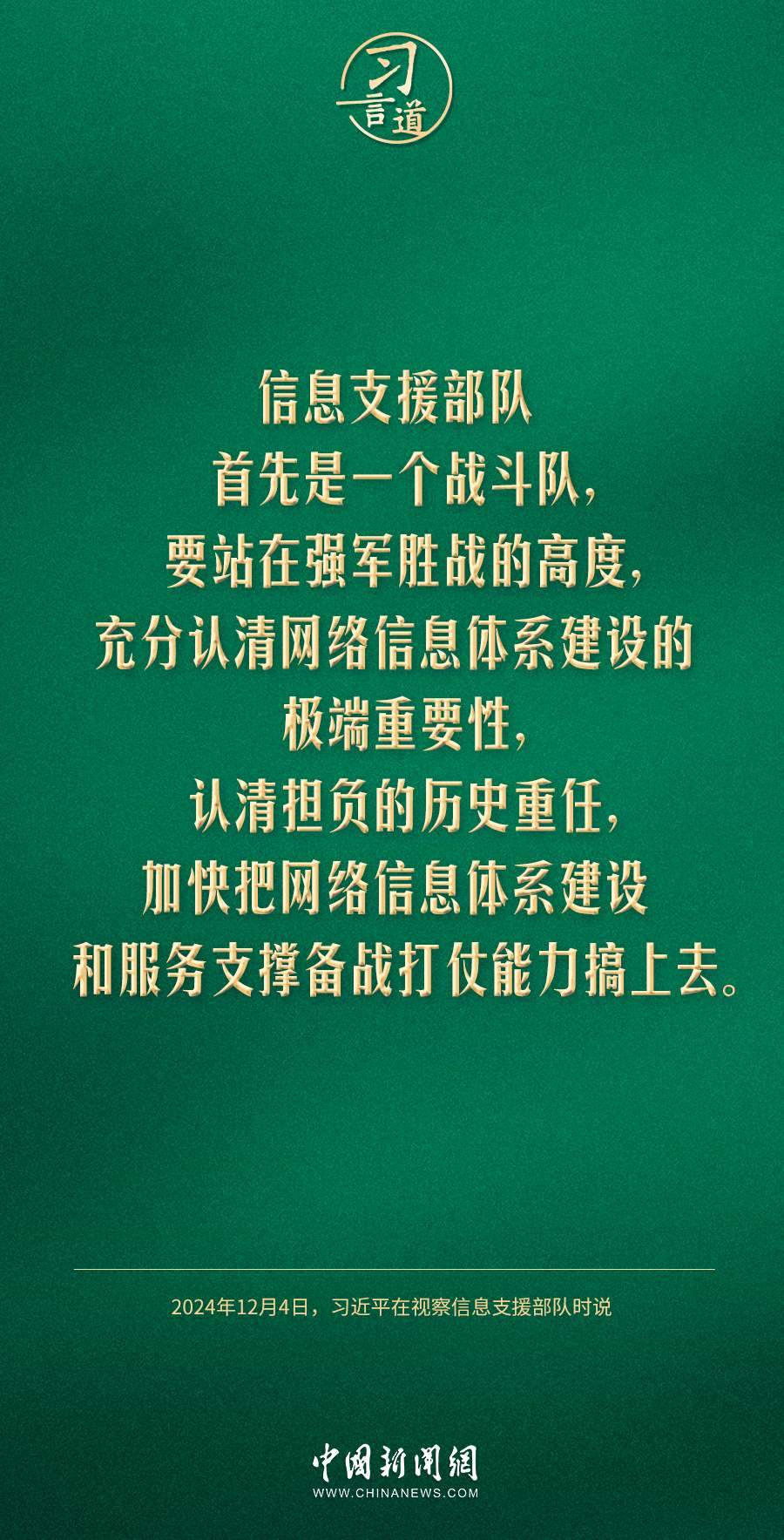 中共中央總書記、國(guó)家主席、中央軍委主席習(xí)近平4日視察信息支援部隊(duì),代表黨中央和中央軍委,對(duì)信息支援部隊(duì)第一次黨代表大會(huì)的召開表示熱烈祝賀,向信息支援部隊(duì)全體官兵致以誠(chéng)摯問候。習(xí)近平指出——