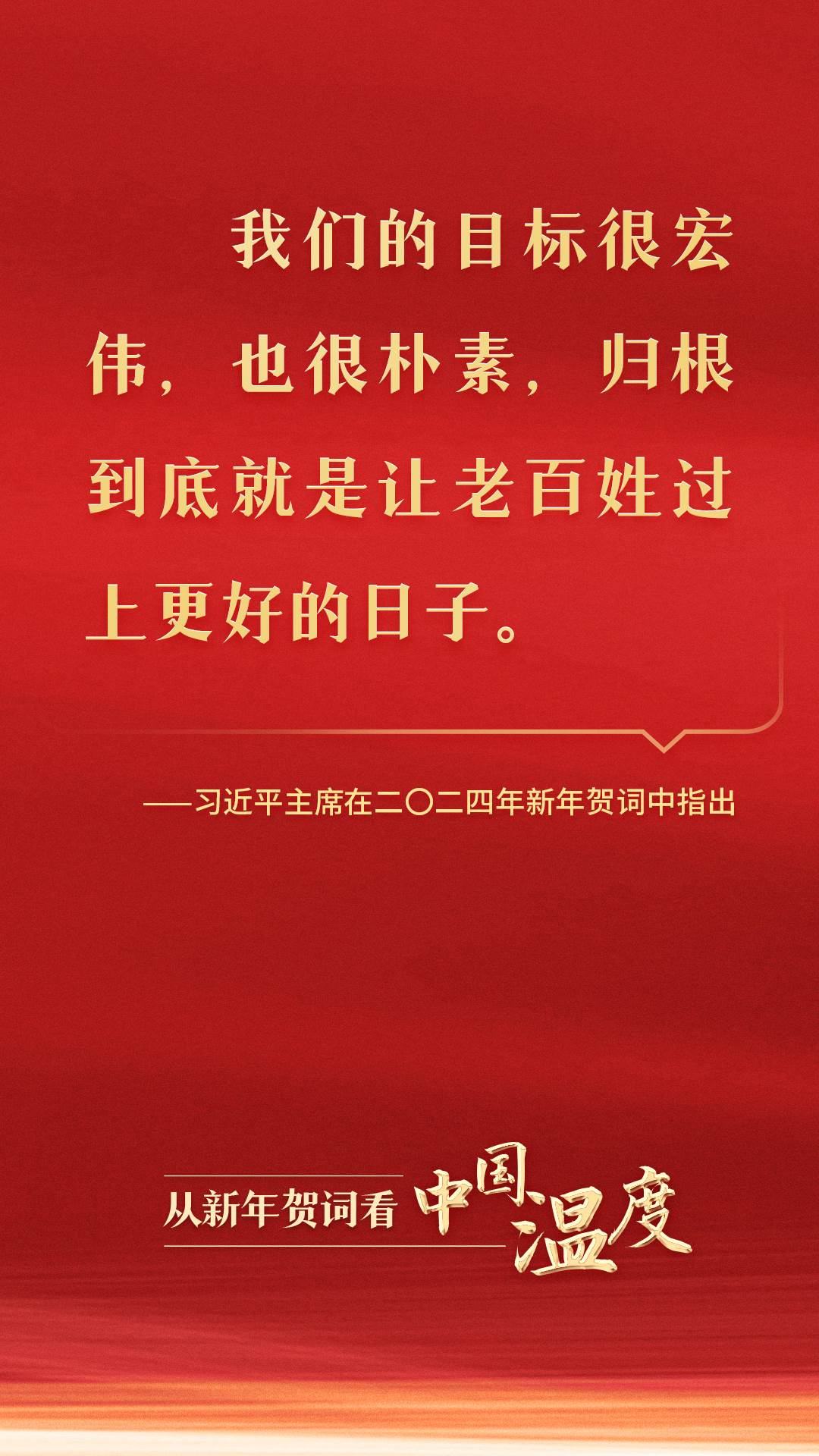 從黃土地走來(lái),從大隊(duì)黨支部書記到黨和國(guó)家最高領(lǐng)導(dǎo)人,習(xí)近平同志深諳國(guó)情、社情、民情。在二〇二四年新年賀詞中,習(xí)近平主席話語(yǔ)懇切:“我們的目標(biāo)很宏偉,也很樸素,歸根到底就是讓老百姓過(guò)上更好的日子?!?/p>
