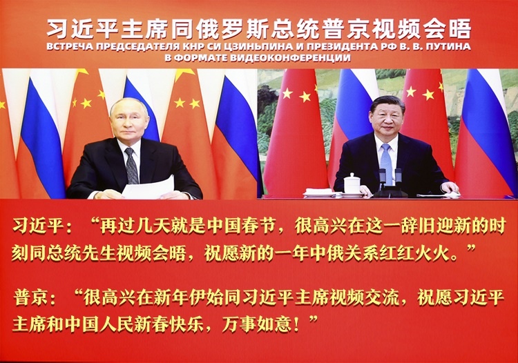 1月21日,中國(guó)國(guó)家主席習(xí)近平在北京同俄羅斯總統(tǒng)普京舉行視頻會(huì)晤,兩國(guó)元首互致新年祝福。習(xí)近平強(qiáng)調(diào),新的一年,我愿同總統(tǒng)先生一道,繼續(xù)引領(lǐng)中俄關(guān)系登高望遠(yuǎn),以中俄關(guān)系的穩(wěn)定性和堅(jiān)韌性應(yīng)對(duì)外部環(huán)境的不確定性,共同促進(jìn)兩國(guó)發(fā)展振興,維護(hù)國(guó)際公平正義。