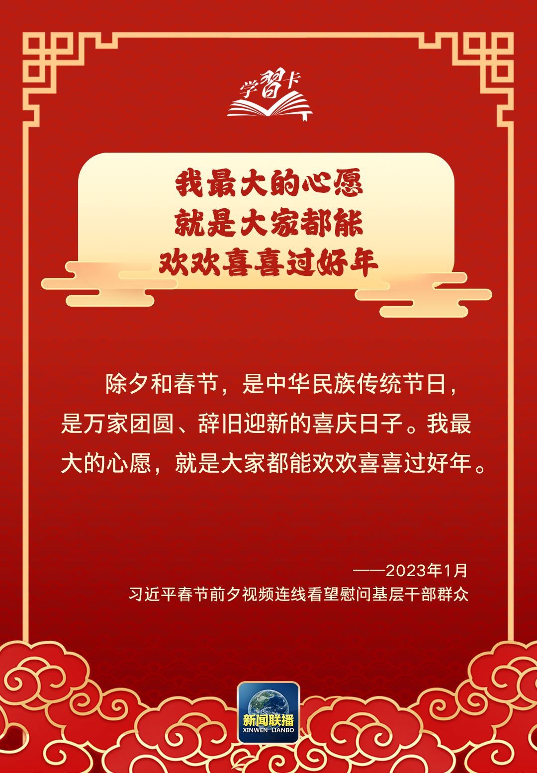 習近平總書記曾說:“我最大的心愿,就是大家都能歡歡喜喜過好年?!痹谶@辭舊迎新、萬家團圓之際,讓我們聆聽總書記的暖心話語,一起學習↓