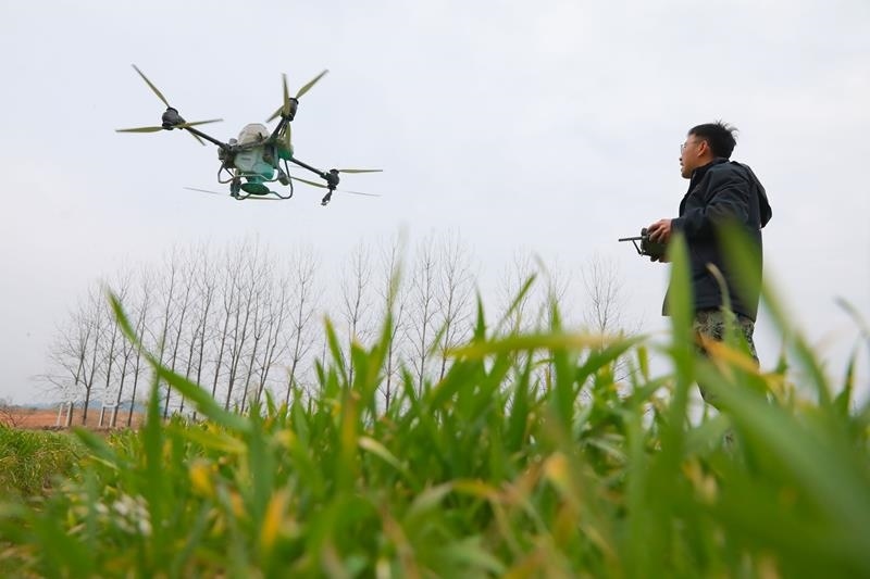 △2025年2月14日,在浙江杭州市臨安區(qū)天目山鎮(zhèn)“天目糧倉”糧食功能區(qū),農(nóng)機人員遙控植保無人機給小麥施肥。