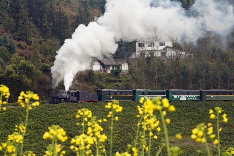 △2025年2月14日,四川樂山市犍為縣菜子壩景點試種的早季油菜花進入盛開期,蒸汽小火車穿越油菜花海,吸引不少游客前來觀看。