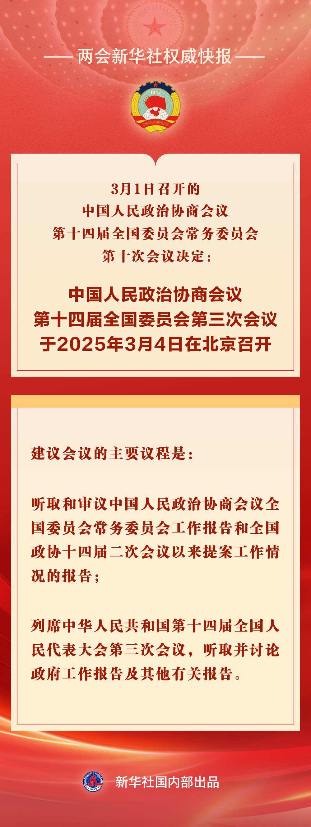 3月1日召開的中國人民政治協(xié)商會(huì)議第十四屆全國委員會(huì)常務(wù)委員會(huì)第十次會(huì)議決定:中國人民政治協(xié)商會(huì)議第十四屆全國委員會(huì)第三次會(huì)議于2025年3月4日在北京召開。建議會(huì)議的主要議程是:聽取和審議中國人民政治協(xié)商會(huì)議全國委員會(huì)常務(wù)委員會(huì)工作報(bào)告和全國政協(xié)十四屆二次會(huì)議以來提案工作情況的報(bào)告;列席中華人民共和國第十四屆全國人民代表大會(huì)第三次會(huì)議,聽取并討論政府工作報(bào)告及其他有關(guān)報(bào)告。