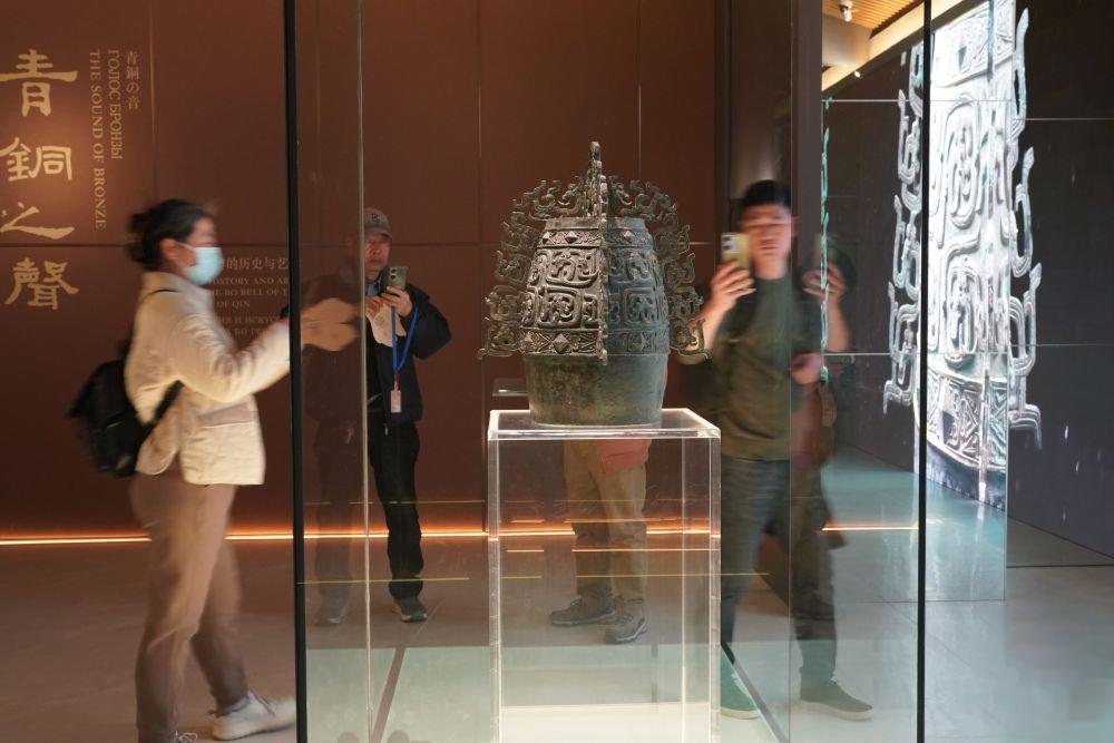 △2月26日,游客在西部機(jī)場博物館珍寶館內(nèi)參觀國家一級(jí)文物“秦公镈”。