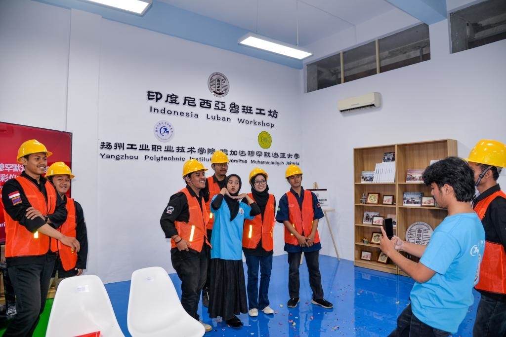 2月28日,在印度尼西亞雅加達,學生在印尼魯班工坊智能制造中心揭牌剪彩儀式后合影。新華社記者 徐欽 攝