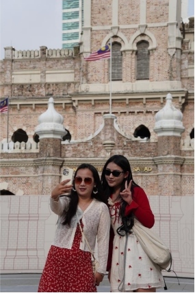 兩名來自中國(guó)云南的游客在馬來西亞首都吉隆坡地標(biāo)性歷史建筑蘇丹阿卜杜勒·薩馬德大廈前合影。人民日?qǐng)?bào)記者 俞懿春攝