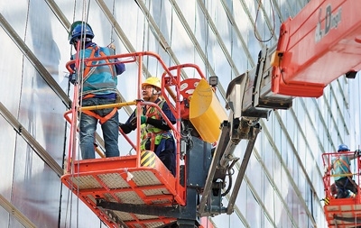 河北省石家莊美術(shù)館建設(shè)現(xiàn)場,工人們?cè)诩泳o施工作業(yè)。