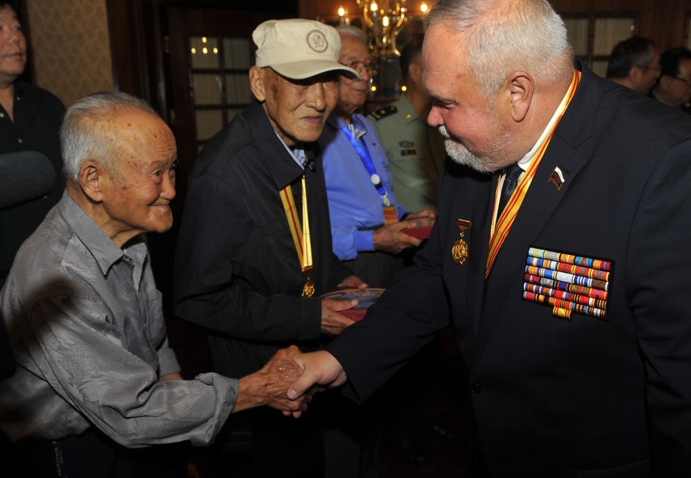 2015年9月5日,二戰(zhàn)蘇軍著名統(tǒng)帥瓦西里·崔可夫的外孫尼古拉·崔可夫(前右)與中國抗戰(zhàn)老兵代表在活動(dòng)現(xiàn)場(chǎng)交流。新華社記者 魯鵬 攝