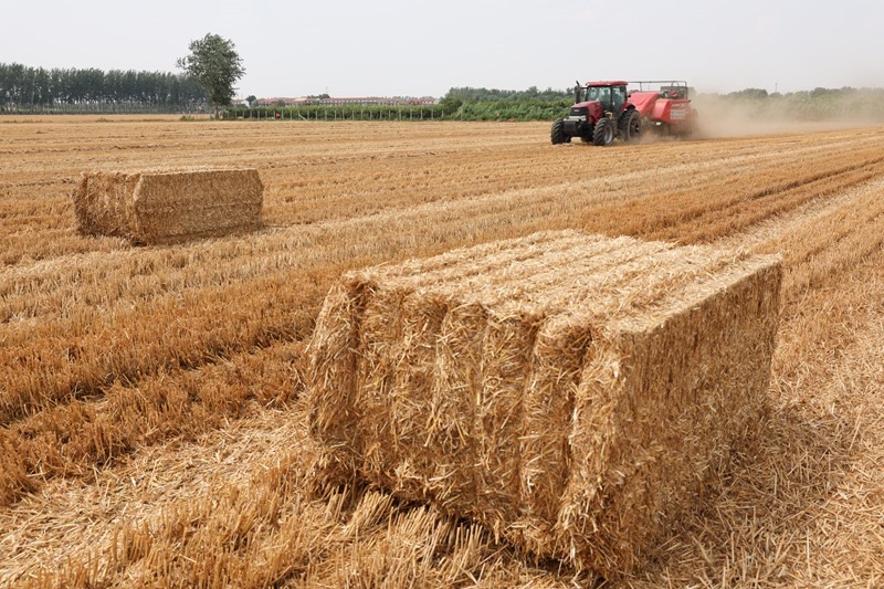 6月18日,在河北石家莊晉州市周家莊鄉(xiāng)北捏盤村麥田,農戶駕駛秸稈打捆機作業(yè)。