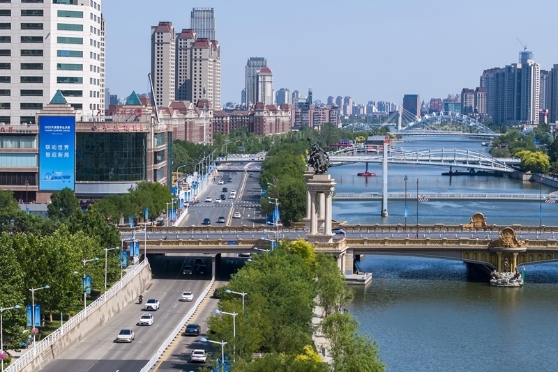 天津市海河沿岸的一棟建筑上懸掛著2025夏季達(dá)沃斯論壇宣傳標(biāo)語(yǔ)(6月21日攝,無(wú)人機(jī)照片)。