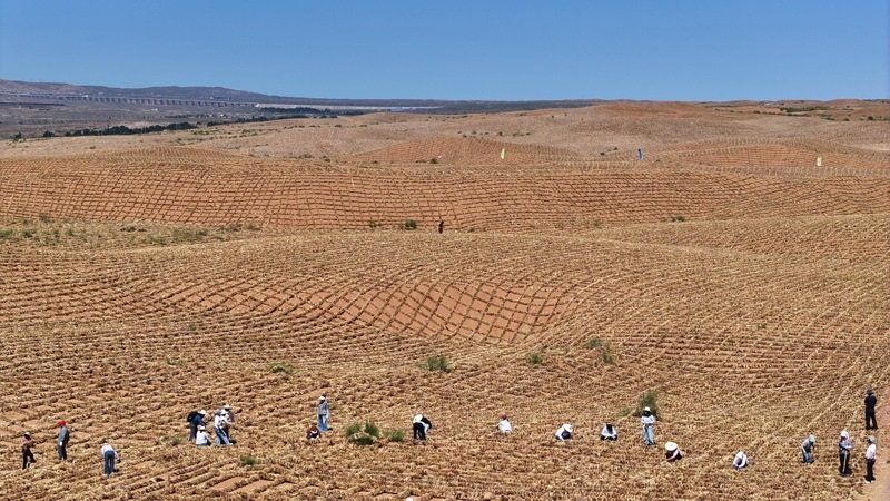 6月30日,在位于寧夏中衛(wèi)市長流水村的騰格里沙漠東南緣,隨著治沙工人將最后一列草方格穩(wěn)穩(wěn)扎下,這項跨越半個世紀的治沙工程,在騰格里沙漠寧夏境內實現(xiàn)全面“鎖定”。一條長153公里、最寬處達38公里的固沙鎖邊帶蜿蜒開來。
