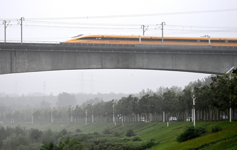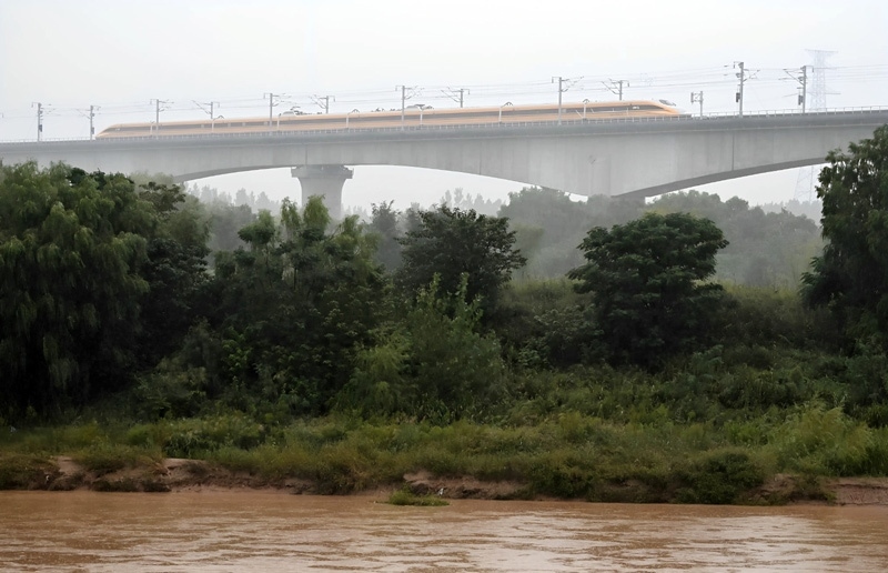 9月11日,聯(lián)調(diào)聯(lián)試綜合檢測(cè)列車駛過(guò)位于陜西省西安市的西延高鐵渭河特大橋。