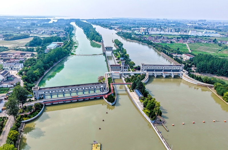 這是位于江蘇省揚州市江都區(qū)的南水北調東線一期工程運鹽閘、邵仙套閘、邵仙閘洞(7月6日攝,無人機照片)。
