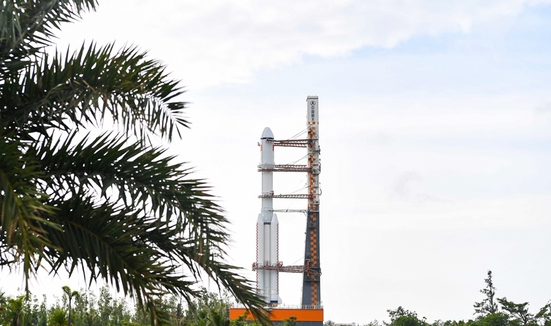 7月12日,天舟九號貨運飛船與長征七號遙十運載火箭組合體垂直轉(zhuǎn)運至發(fā)射區(qū)。