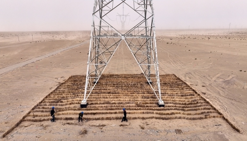 新疆和田地區(qū)于田縣,施工人員在線路塔基下鋪設(shè)草方格(4月24日攝)。