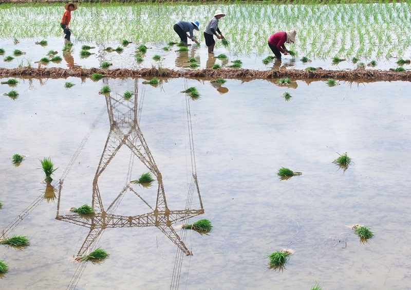 7月13日,湖南省衡陽市衡東縣霞流鎮(zhèn)農(nóng)民在搶插晚稻(無人機(jī)照片)。