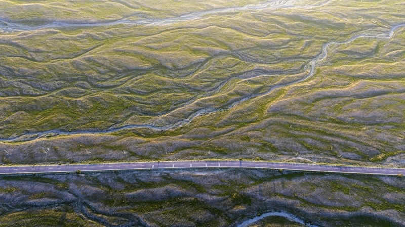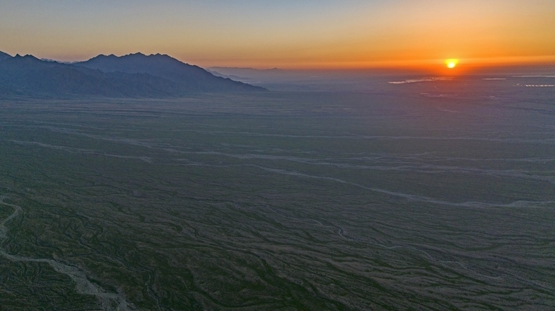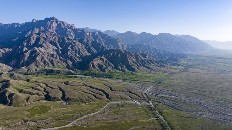 賀蘭山下的戈壁灘草木茂盛(7月29日攝,無人機(jī)照片)。