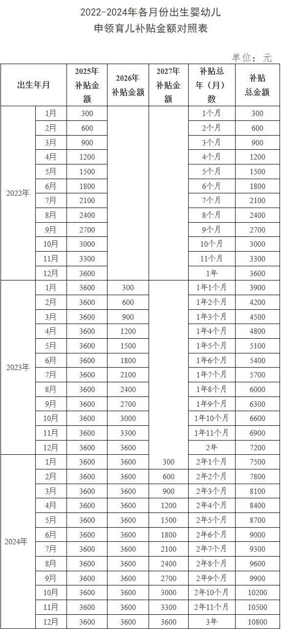 其中,對2025年1月1日之前出生、不滿3周歲的嬰幼兒,按應(yīng)補貼月數(shù)折算計發(fā)補貼。也就是說,2022年1月1日以后出生的符合條件的嬰幼兒,都可以領(lǐng)取育兒補貼。