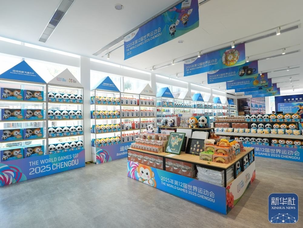↑ 這是8月3日在成都世運會運動員村A區(qū)拍攝的官方特許商品零售店內(nèi)的紀念品。新華社記者 王曦 攝