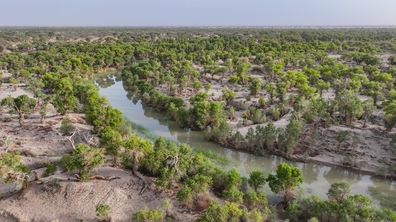 8月6日,在新疆巴音郭楞蒙古自治州尉犁縣境內(nèi)拍攝的胡楊林(無(wú)人機(jī)照片)。