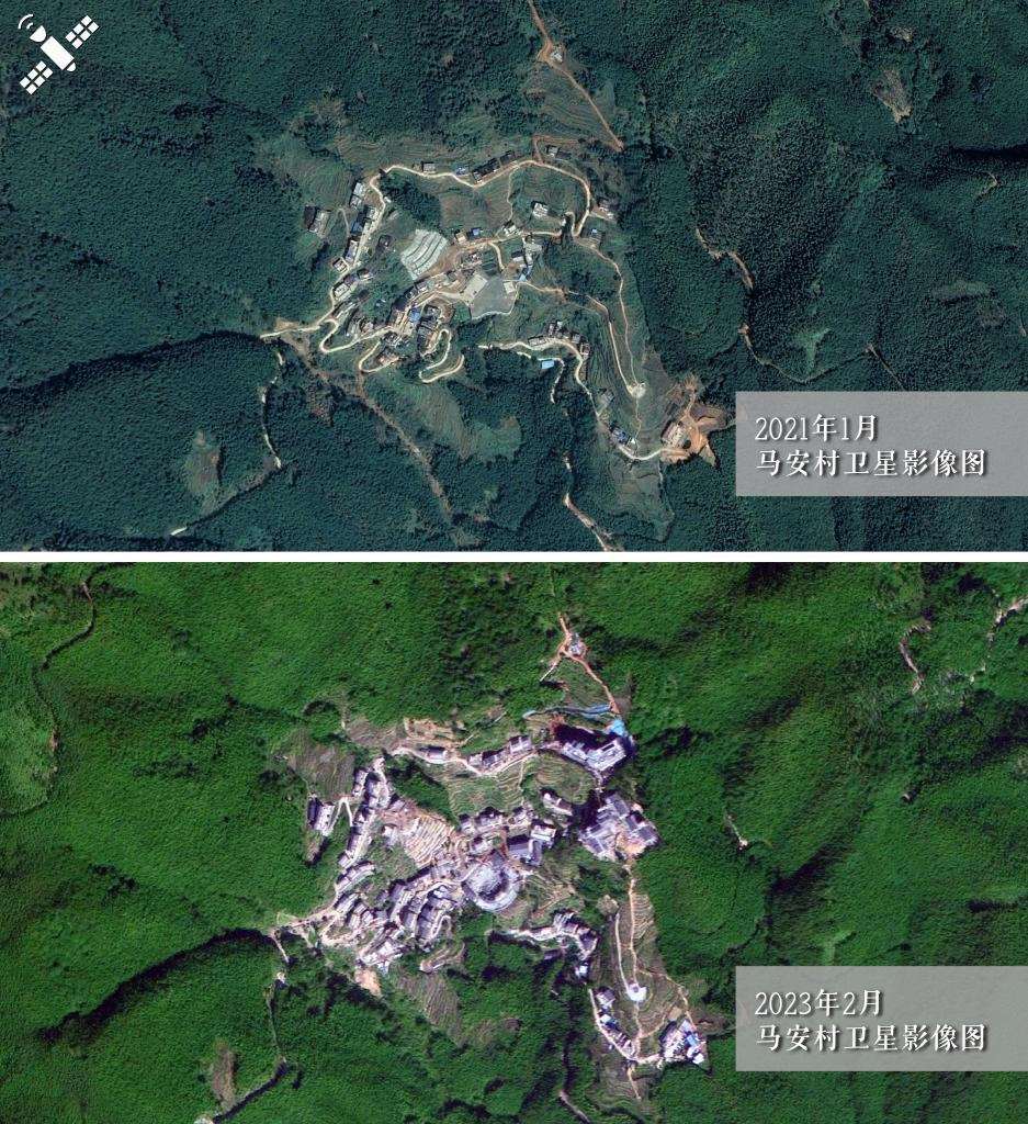 解讀:2021年1月村落原貌(上圖)對比2023年2月新貌(下圖),馬安村文旅建筑群規(guī)模顯現(xiàn)。