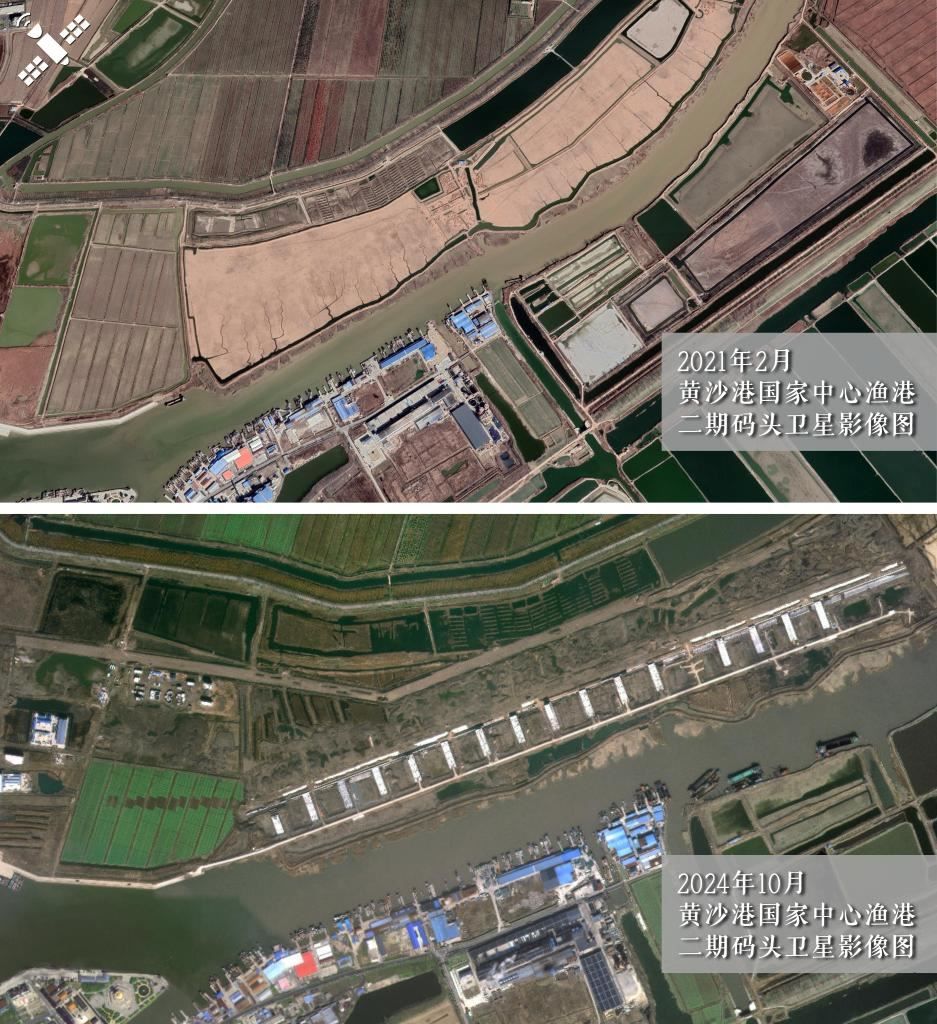 解讀:2021年2月施工初期(上圖)對比2024年10月(下圖),黃沙港國家中心漁港二期工程碼頭主體已建成。