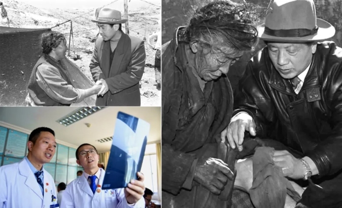 左上圖為來自陜西的援藏干部、阿里日土縣副縣長賈冗勇深入牧區(qū),幫助藏族牧民解決生產(chǎn)、生活的實際困難(新華社記者土登攝,1997年11月11日發(fā));左下圖為2017年8月3日,北京積水潭醫(yī)院援藏醫(yī)生龔曉峰(右)和北京天壇醫(yī)院援藏醫(yī)生李家謀在拉薩市人民醫(yī)院骨科病房內(nèi)查看患者的X光片(新華社記者晉美多吉攝);右圖為孔繁森(右)在阿里日土縣過巴鄉(xiāng)為孤寡老人益西卓瑪治?。ㄐ氯A社記者土登攝,1994年12月26日發(fā))。