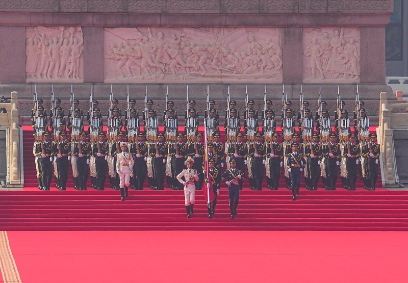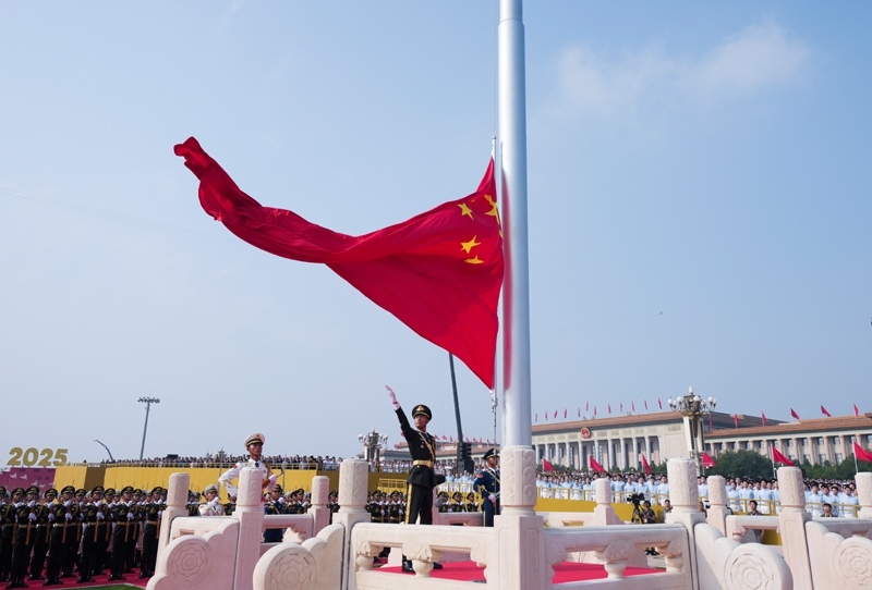 9月3日,紀(jì)念中國(guó)人民抗日戰(zhàn)爭(zhēng)暨世界反法西斯戰(zhàn)爭(zhēng)勝利80周年大會(huì)在北京天安門廣場(chǎng)隆重舉行。這是國(guó)旗護(hù)衛(wèi)隊(duì)從人民英雄紀(jì)念碑基座出發(fā),走向旗桿基座。