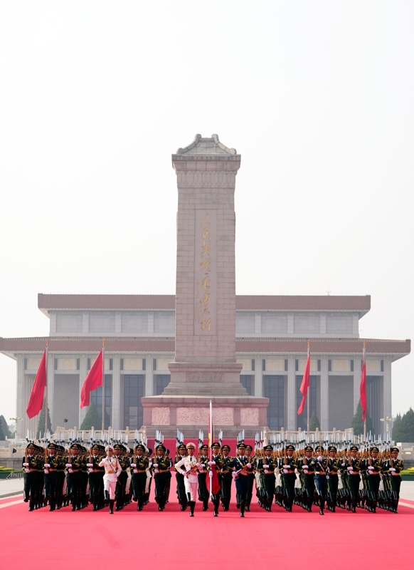 9月3日,紀(jì)念中國(guó)人民抗日戰(zhàn)爭(zhēng)暨世界反法西斯戰(zhàn)爭(zhēng)勝利80周年大會(huì)在北京隆重舉行。這是國(guó)旗護(hù)衛(wèi)隊(duì)從人民英雄紀(jì)念碑基座出發(fā),走向旗桿基座。