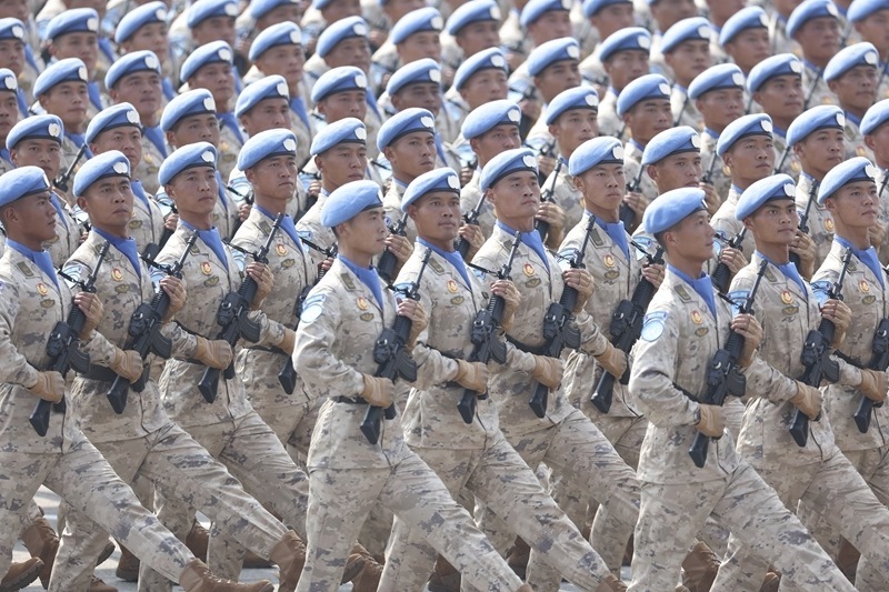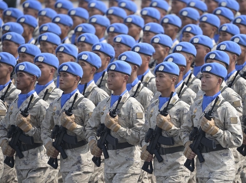 9月3日,紀(jì)念中國(guó)人民抗日戰(zhàn)爭(zhēng)暨世界反法西斯戰(zhàn)爭(zhēng)勝利80周年大會(huì)在北京隆重舉行。這是維和部隊(duì)方隊(duì)通過(guò)天安門廣場(chǎng)。