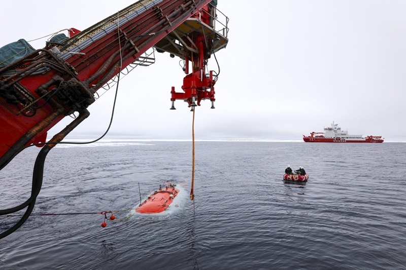 8月11日,“蛟龍”號(hào)在北極冰區(qū)準(zhǔn)備下潛(無(wú)人機(jī)照片)。
