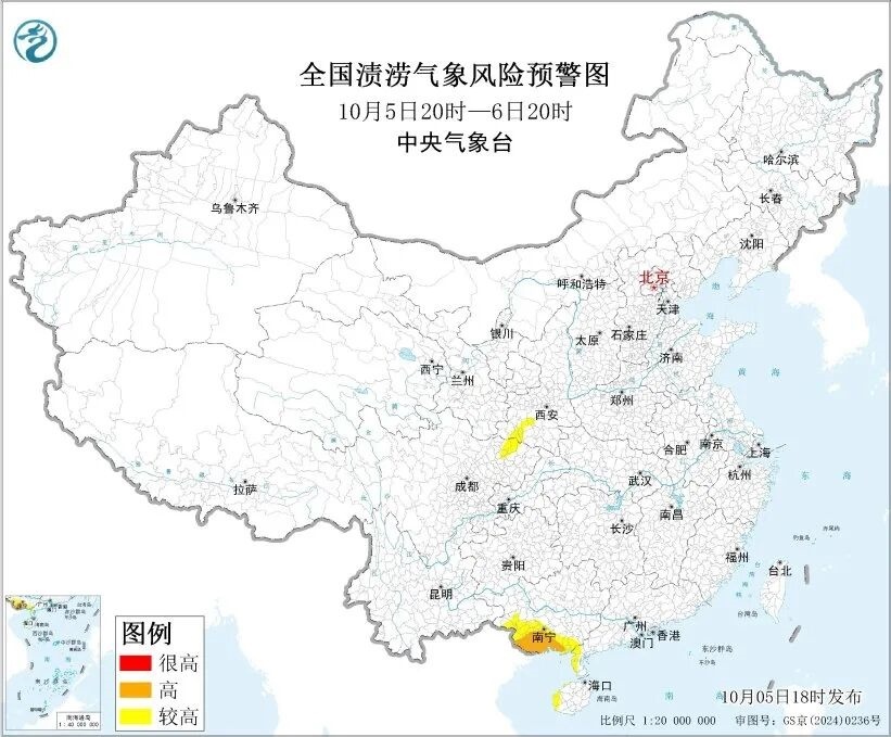 中央氣象臺10月5日18時發(fā)布漬澇風(fēng)險(xiǎn)氣象預(yù)報(bào):受強(qiáng)降雨的影響,預(yù)計(jì)10月5日20時至6日20時,廣東西南部、廣西南部和西部、海南西部、四川東北部、陜西西部等地部分地區(qū)發(fā)生漬澇的氣象風(fēng)險(xiǎn)較高,其中,廣西南部等地部分地區(qū)發(fā)生漬澇的氣象風(fēng)險(xiǎn)高,易形成城市內(nèi)澇和農(nóng)田漬害,需加強(qiáng)防范。