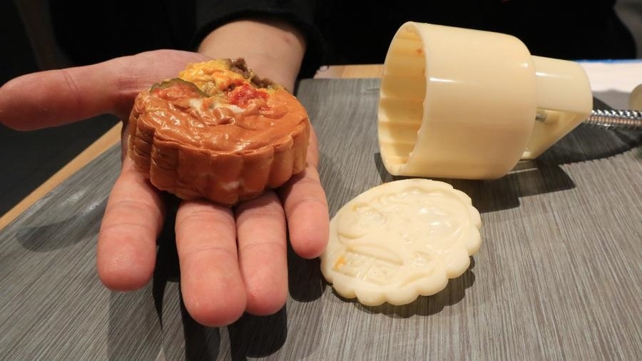 年輕人壓制成的“漢堡月餅”。 新華社記者 樊欣陽(yáng) 攝