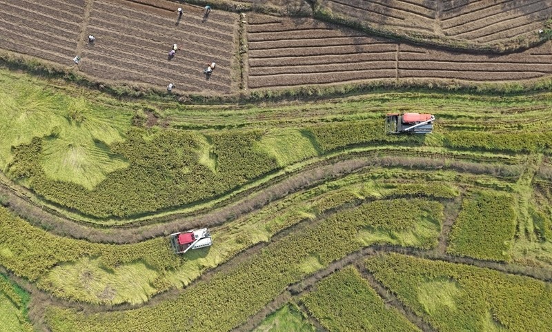 10月17日,在浙江省臺(tái)州市仙居縣雙廟鄉(xiāng),農(nóng)機(jī)手駕駛農(nóng)機(jī)收割晚稻(無(wú)人機(jī)照片)。
