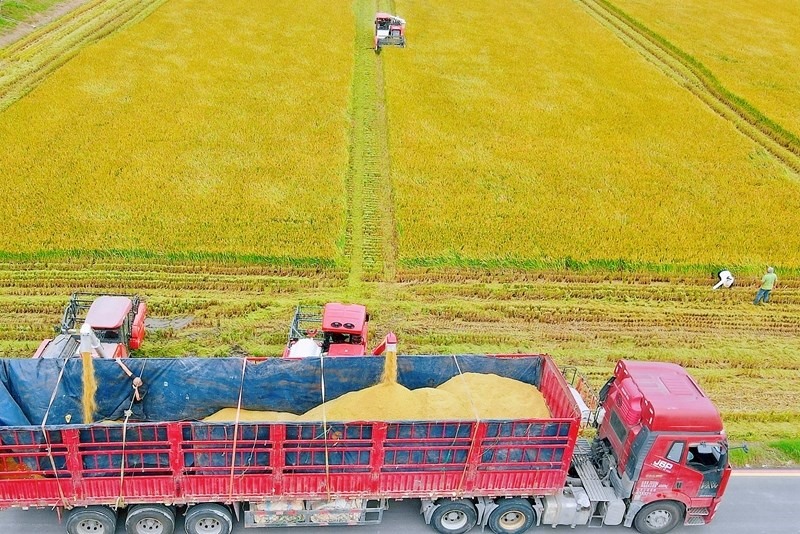 10月16日,在江蘇省如皋市城北街道平園池村,農(nóng)機(jī)手將收獲的水稻裝入運(yùn)糧車(chē)(無(wú)人機(jī)照片)。