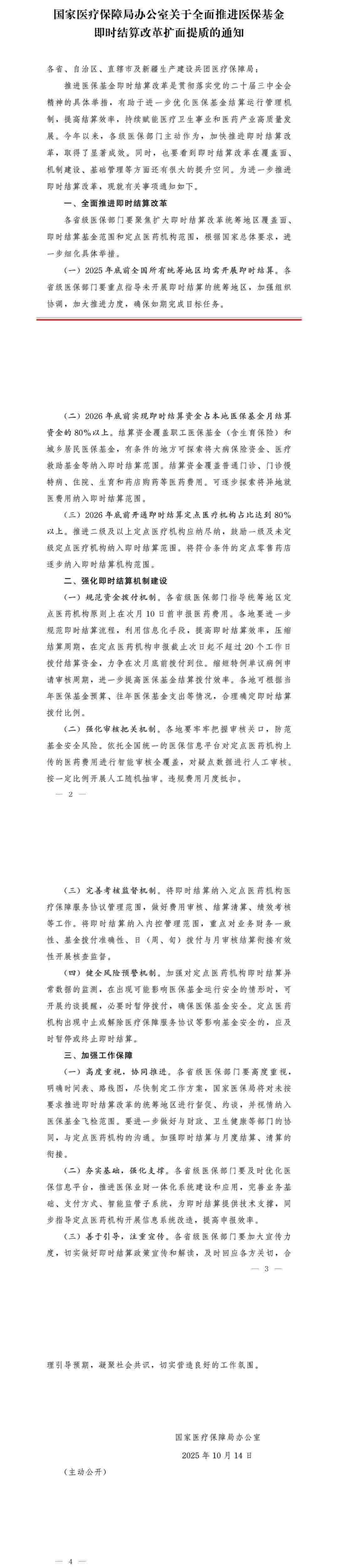據(jù)國家醫(yī)保局官方微信消息,國家醫(yī)療保障局辦公室發(fā)布《關(guān)于全面推進醫(yī)保基金即時結(jié)算改革擴面提質(zhì)的通知》。全文如下: