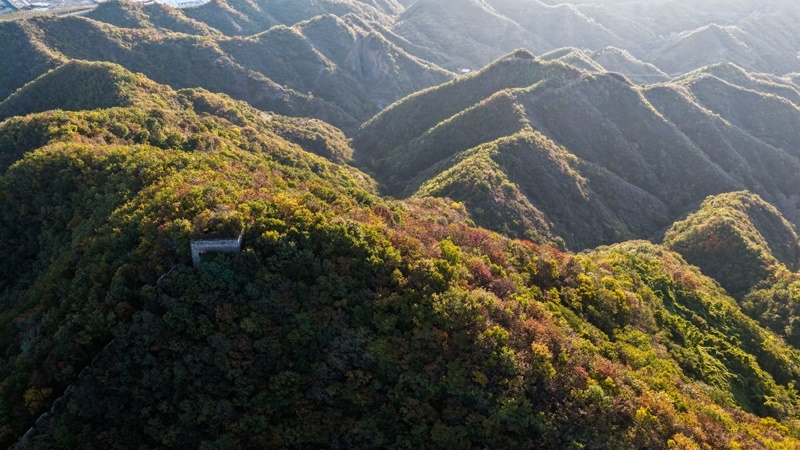 10月18日在河北省唐山市遷西縣上營(yíng)鎮(zhèn)拍攝的青山關(guān)長(zhǎng)城秋景(無(wú)人機(jī)照片)。