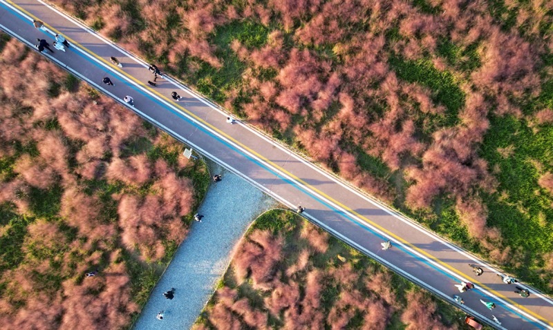 10月18日,游客在山東省東營(yíng)市東營(yíng)區(qū)耿井濕地粉黛亂子草“花海”拍照打卡(無(wú)人機(jī)照片)。